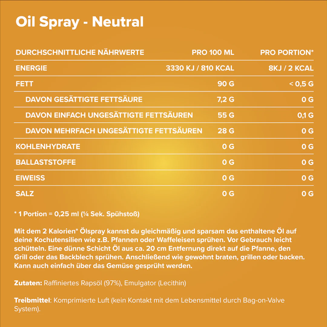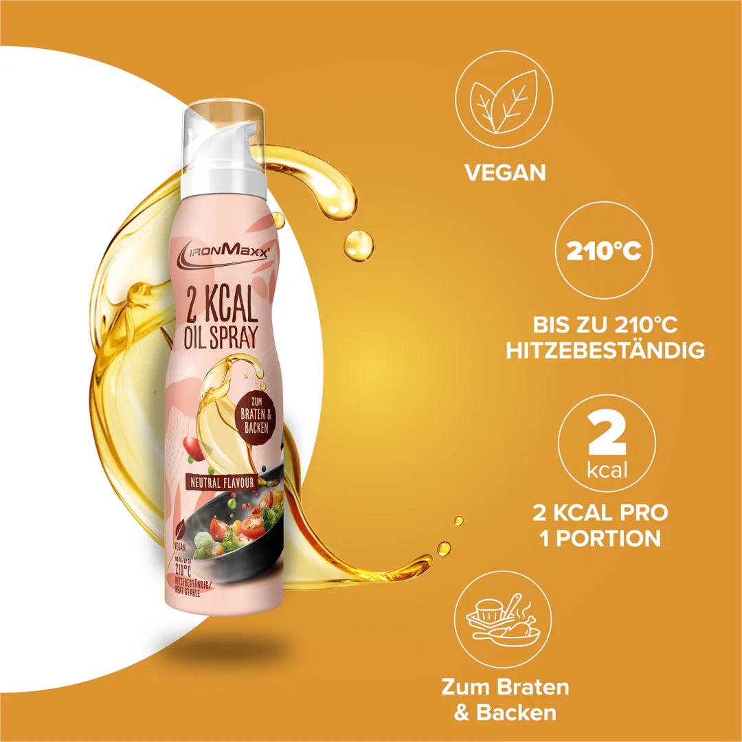A 2 kcal Olajspray (200ml) – IronMaxx® egy praktikus, repceolaj alapú főzőspray, natúr és finom vajas ízzel – ideális sütéshez, főzéshez és grillezéshez. A szórófejnek köszönhetően az olaj egyenletesen és takarékosan adagolható.