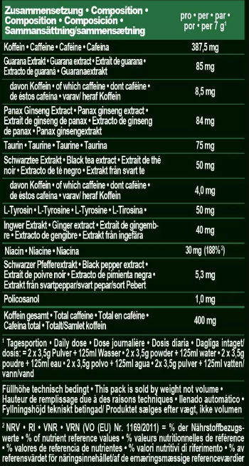 – többek között koffeinnel, guaranával, taurinnal és l-tirozinnal dúsítva,