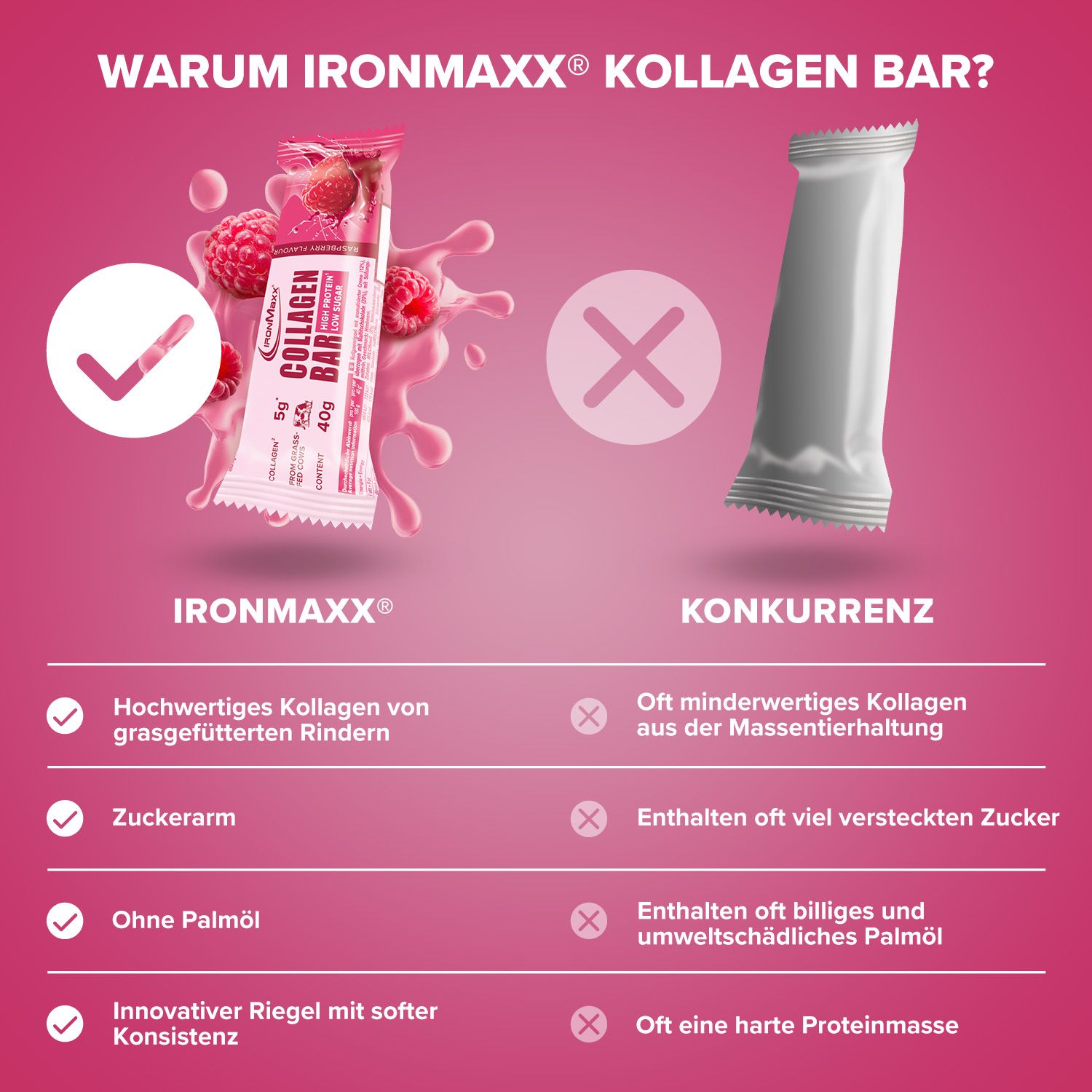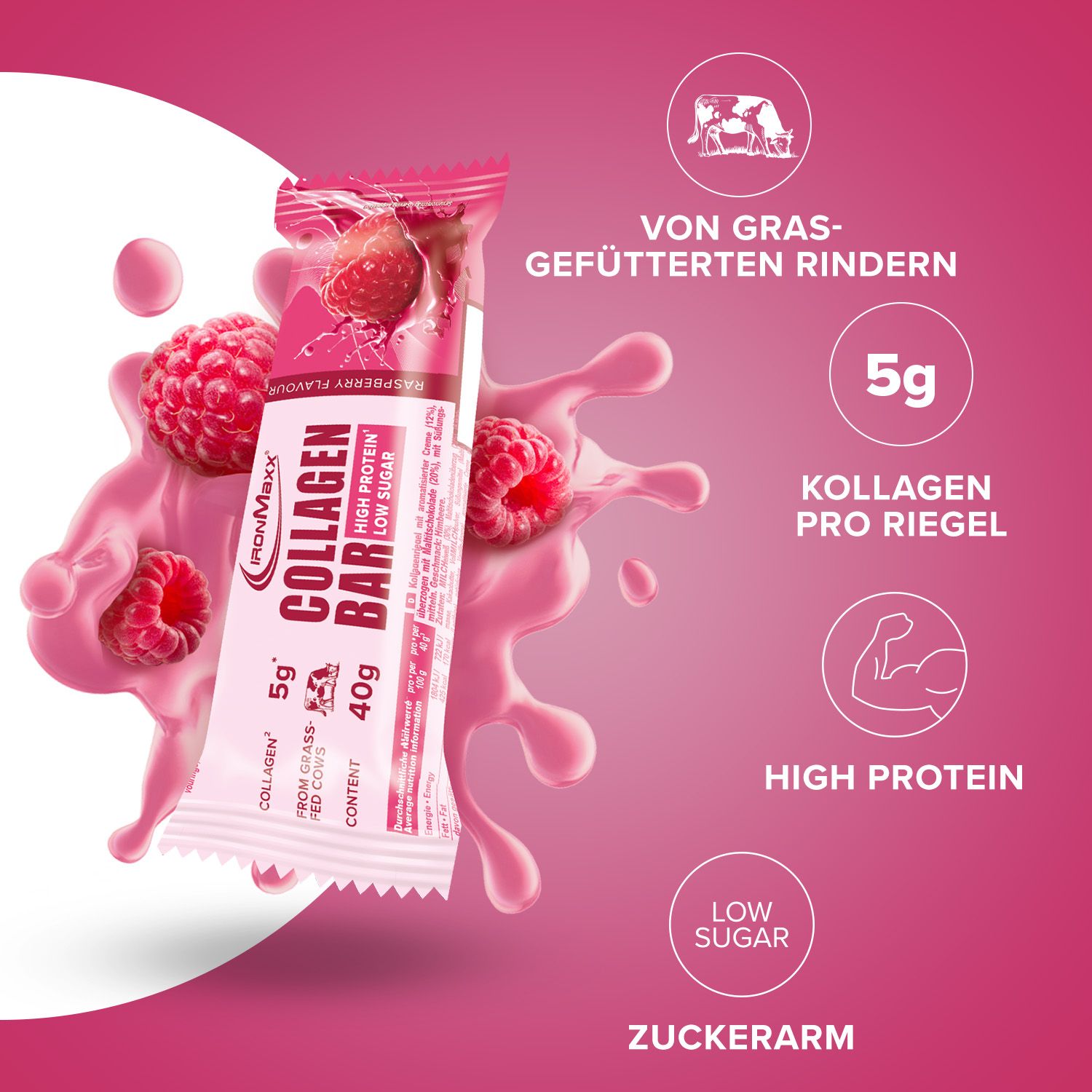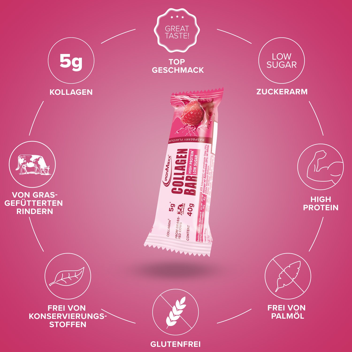 A Collagen Bar – IronMaxx® minden szépség- és egészségtudatos embernek szól, aki egy extra adag kollagénnel szeretne valami jót tenni a testéért. Magas fehérjetartalmának és alacsony cukortartalmának köszönhetően ez a szelet az élvezet és a funkcionalitás tökéletes kombinációját kínálja. A benne található kollagén legeltetett szarvasmarhákból származik.