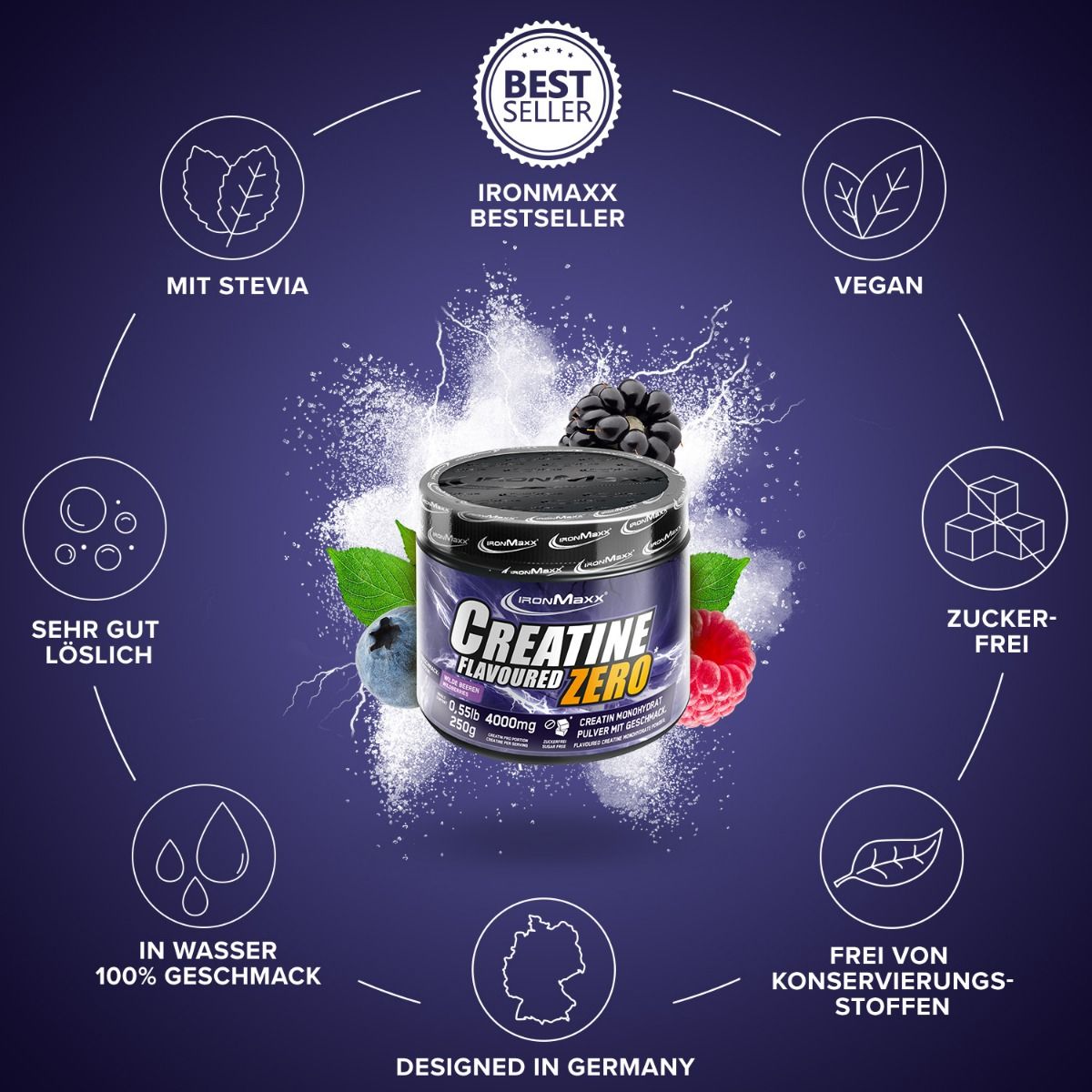 A Creatine Flavoured ZERO (250g) IronMaxx® segítségével egy kreatin-monohidrátban gazdag, ízletes italhoz juthatunk. Kifejlesztésénél kimondottan ügyeltek a minimális szénhidráttartalomra, így kiválóan alkalmazható a diéta időszakában. Édesítőszerként steviát használtak, mesterséges színezőanyagokat nem alkalmaztak. A Creatine Flavoured ZERO (250g) IronMaxx® enyhe színét, növényi származékoknak köszönheti. Kiválóan oldódik vízben, és adagolása is egyszerű.