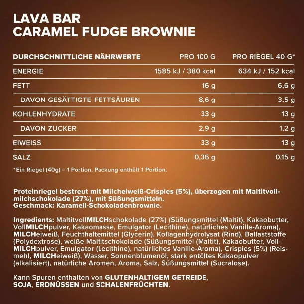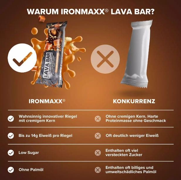 Az IronMaxx® vadonatúj Lava bárja felháborítóan finom és igazi csemege! A különlegessége: a hihetetlenül lágy és krémes töltelék a szelet közepén, majd ropogós diódarabok az optimális ropogós hatás érdekében, végül finom csokoládéval bevonva. A finomság elolvad a szádban – akár a forró láva. Aki nem tud és nem akar nélkülözni egy finom, krémes csokoládét a diétás fázisban, most boldog lesz: az IronMaxx® lávaszelet még a hagyományos csokoládénál is jobb ízű. Végre búcsút inthetnek a száraz fehérjemasszával és a saját fehérje ízével rendelkező fehérjeszeleteknek – a Lava Bar 40g IronMaxx® új mércét állít fehérjerétegével. Készen állsz arra, hogy hagyd, hogy a vulkán kitörjön, és hagyd, hogy a láva elolvadjon a szádban?