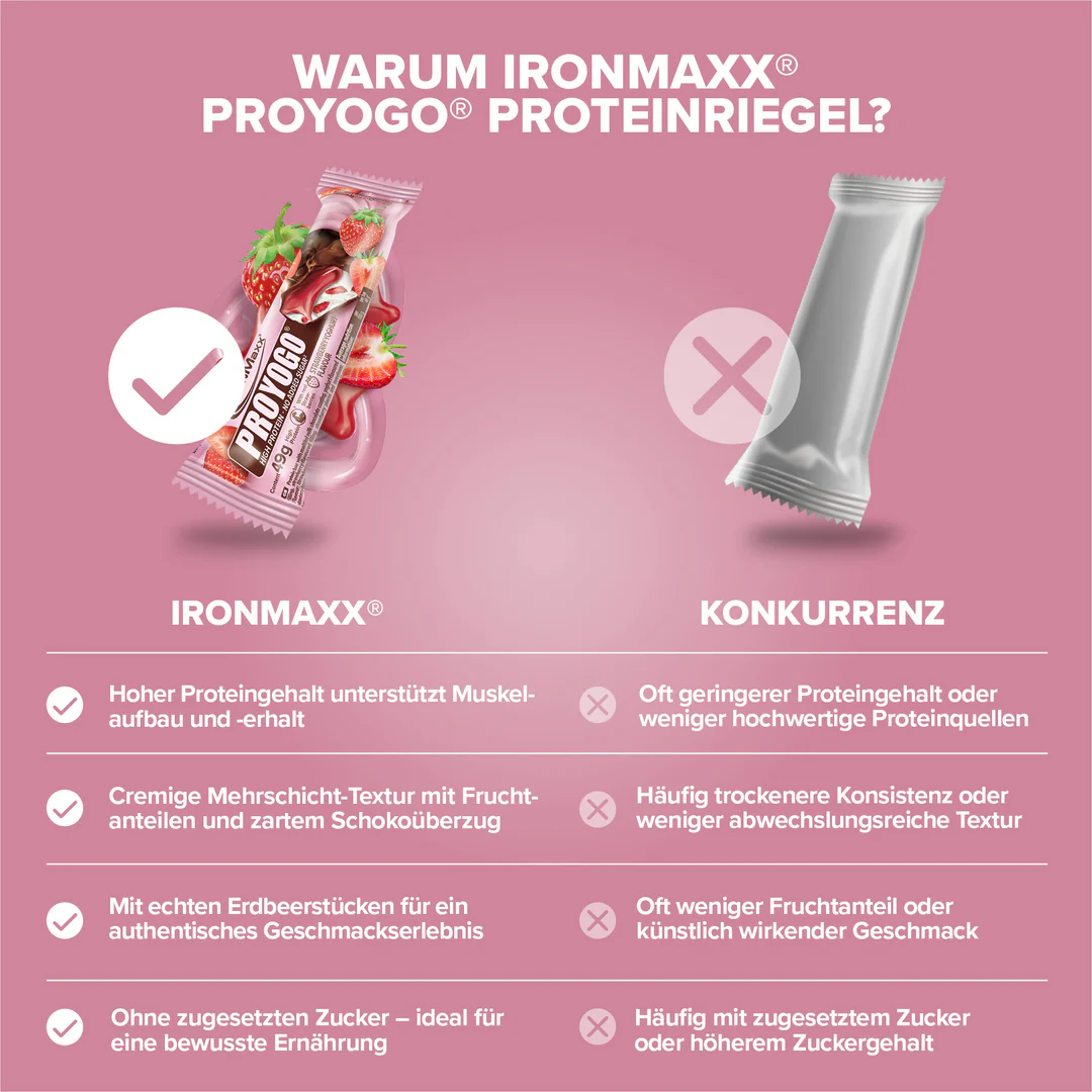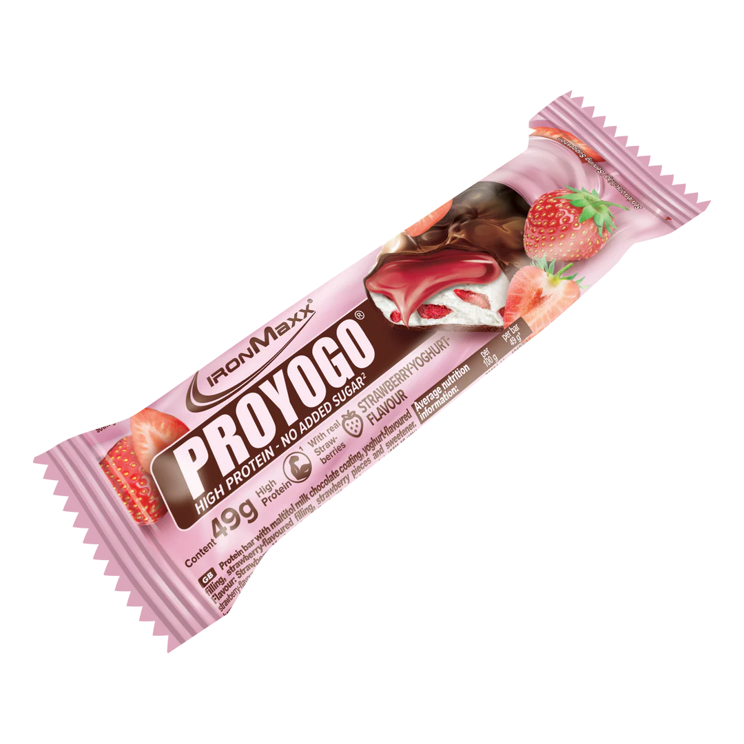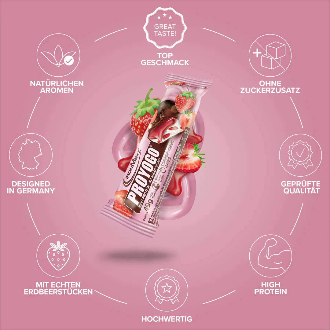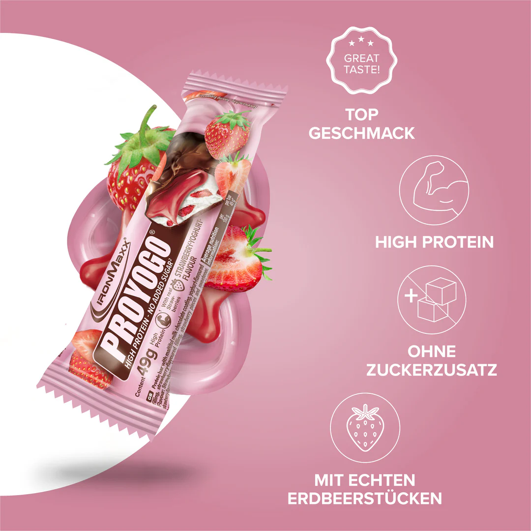 A Proyogo® (49g) – IronMaxx® egy krémes fehérjeszelet epres joghurtos töltelékkel, amely ötvözi az élvezetet és a funkcionalitást. A sima tejcsokoládé, a gyümölcsös töltelék és a finom gyümölcsdarabok kombinációja kiegyensúlyozott ízélményt teremt – ideális mindazok számára, akik finom fehérjetartalmú snacket keresnek a mindennapokra.
