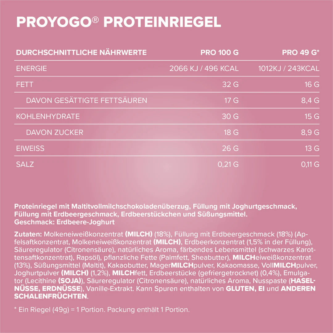 Tejsavófehérje-koncentrátum (TEJ) (18%), eperízű töltelék (18%) (almalé-koncentrátum, tejsavófehérje-koncentrátum (TEJ), eperkoncentrátum (1,5% a töltelékben), savanyúságot szabályozó anyag (citromsav), természetes aroma, ételszínezék (fekete sárgarépa-koncentrátum), repceolaj), növényi zsírok (pálmazsír, sheavaj), TEJfehérje-koncentrátum (13%), édesítőszer (maltitol), kakaóvaj, sovány tejpor, kakaómassza, teljes TEJpor, joghurtpor (TEJ) (1,2%), TEJzsír, liofilizált eperdarabok (0,4%), emulgeálószer (lecitinek (SZÓJA)), savanyúságot szabályozó anyag (citromsav), természetes aroma, diópüré (MOGYORÓ, FÖLDIMOGYORÓ), vanília kivonat.